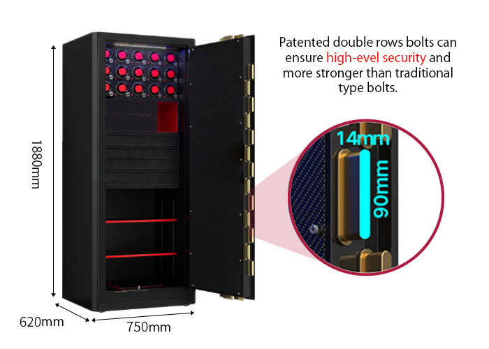Door: Likely features a thicker door (e.g., 10-12mm) with multiple heavy-duty locking bolts.